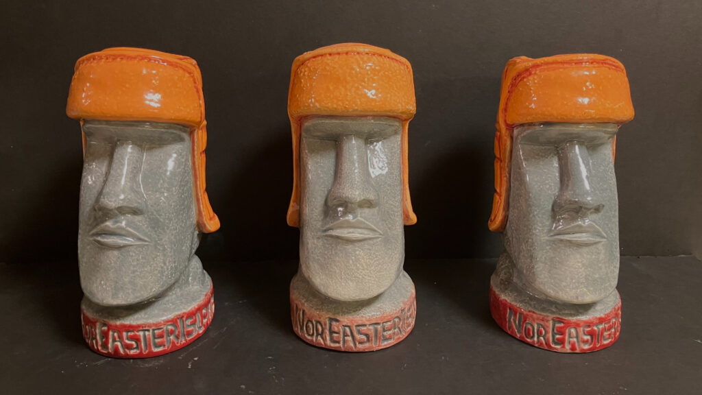 These are listed for pre-sale on our ticket website at $50 each. Below are photos of the final production mug plus some pics of the sculpting and firing process. Paul, asks to note that this is strong long lasting mug, but as shown below, there may be some glaze/texture variations since this is a handmade piece This Moai man with his warm winter cap, will be the perfect little friend to keep your drink cold and brave the storm of this year’s Nor’Easter! All mugs purchased by event attendees will be handed out at check-in. If purchasing a mug, but not attending the event, you can pick it up from us or arrange to have it shipped for an additional cost. Email gbvintagesociety@gmail.com with questions.